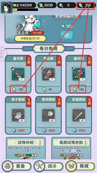1、进入【每日商城】,购买【鎏光靴-8折】需要消耗【160仙晶】对应的道具,【鎏光腕-6折】则需花费【120仙晶】进行兑换。