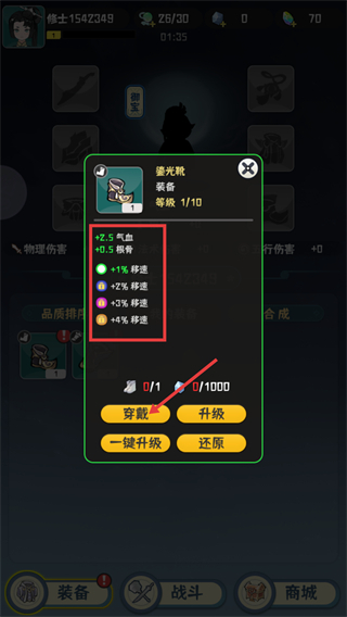 2、查看【鎏光靴-装备-等级1/10】,其属性包含【+2.5-气血】【+0.5-根骨】以及移动速度加成,点击【穿戴】按钮就能装备该道具来提升自身属性。