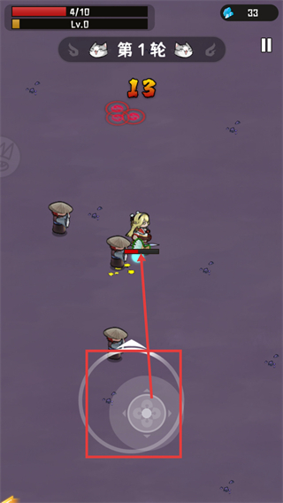 3、当前战斗处于【第1轮】阶段,进度为【4/10】,等级为【Lv.0】。请通过底部的操控按钮来操作角色,目标是攻击那些戴着斗笠的敌人,同时注意留意右侧显示的【33】颗钻石资源。