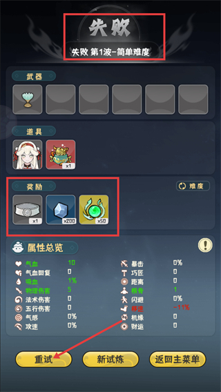 4、若出现【失败-第1波-简单难度】的情况,可在领取【奖励】道具后点击【重试】,同时要留意属性总览里【-11%-移速】的状态调整。
