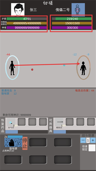 3、进行【切磋】时,要关注自身的【护体-4791】和【傀儡二号-219/240】属性情况,掌握好普通攻击的节奏,防止护体提前破损。