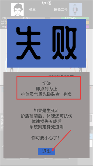 4、若【切磋】未能成功,需牢记【护体灵气先被破除的一方判定为负】这一规则,点击【退出】按钮后提升自身的护体属性,随后再次尝试发起挑战。