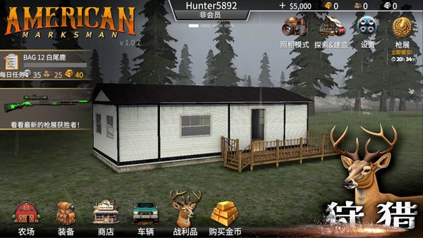 猎鹿人神枪手是一款以荒野冒险为背景的户外狩猎射击游戏,在这里玩家扮演喜好户外狩猎的用户,在美国各地购买土地并邀请好友一起来建立营地、探索荒野,享受悠闲的户外时光。虽然在玩法上看似以射击为主,但它更像是一款荒野求生游戏,但没有挖掘房屋躲避风雪等内容,而是荒野求生中另外一个非常重,美术风格采用逼真的3D立体写实风,游戏里设置了草原、山地、丘陵以及雪山等地形,你可以建立起堪比农场仓库般的庇护所,也能随意更换服饰前往丛林中切身体验户外狩猎的乐趣,游戏的节奏也相对放松,可以狩猎也可以体验建造的快感,将心灵与精神都融入进狩猎当中,还能与好友一起畅谈、共同冒险。如果你喜欢射击也喜欢荒野求生题材的游戏,那么请一定不要错过American Marksman
