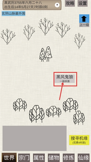 2、在该区域遭遇【黑风鬼狼-一级妖兽】,可发起挑战,花费【4时辰】搜寻机缘后优先选其作为初期历练目标。