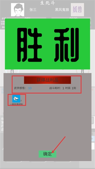 4、战斗胜利后点击【确定】,领取【武学感悟-10】与【一级妖兽材料-7】,这些资源可用于后续武技升级与修炼。