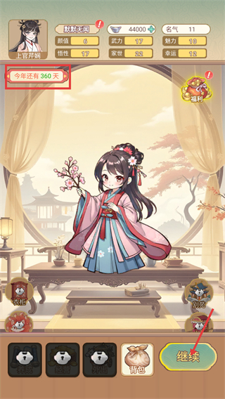 当处于当前界面时,请注意查看【今年还有-360天】的时间提示。你可以通过【衣柜】和【别苑】这两个功能进行互动,之后点击【继续】按钮来推进游戏流程。