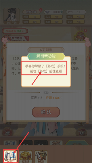 4、【6岁-剧情】环节解锁【养成】系统,在领取【家世+5】【银两+6000】的奖励后,点击【确认】按钮,随后前往【养成】界面查看相关功能。