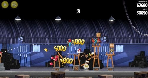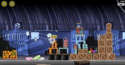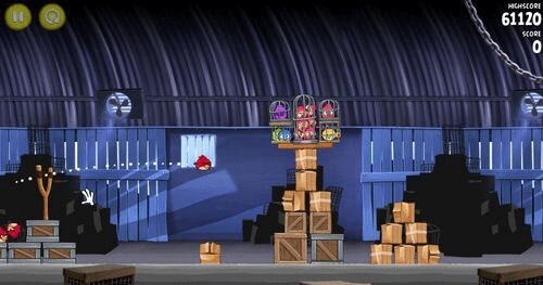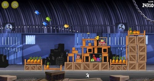 这一关操作起来有些棘手,对瞄准目标的精度要求比较高。你得操控黄色小鸟,对准建筑物中间那部分的方块空心木架射击,并且要保证第一时间摧毁第一个笼子。只要用一只小鸟完成任务,就能拿到三星评价。