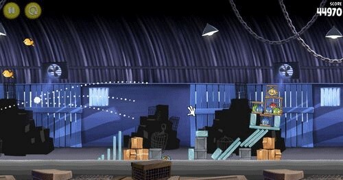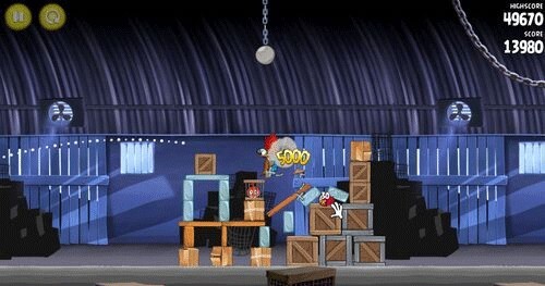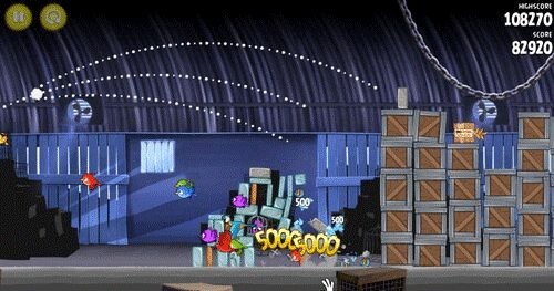 这一关的玩法和前面类似:先让小鸟散射,把前面两个建筑物摧毁掉;接着让剩下的物件去推倒最右边的建筑物。