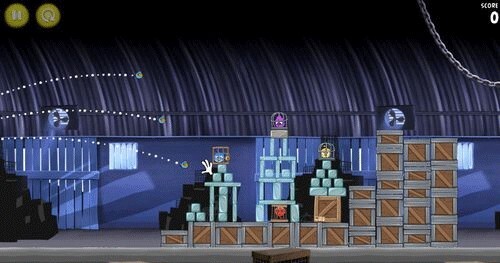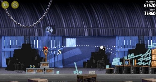 如下图所示,射击目标需瞄准障碍物的下部。同时要确保你的红色小鸟最终击中最右侧的笼子,促使整个障碍物失去平衡并向左倾倒。仅用一只小鸟完成任务即可获得三星评价。