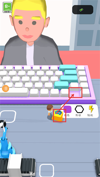 4、选中包含【颜色】-【形状】-【贴纸】选项的方块,将其与键盘区域的对应按键进行匹配,完成方块的属性配置,为后续操作做好准备。