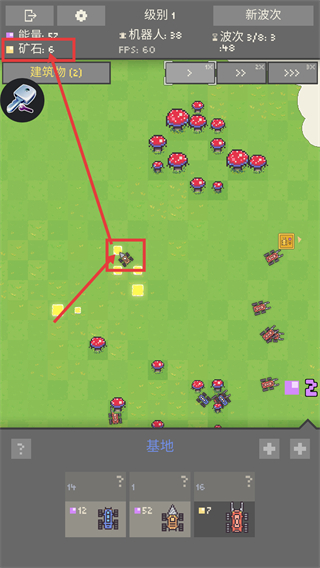 1、在级别1【波次2/8:2】时,合理分配【装载机】【矿工】【防御者】,手动控制机器人,保障基地资源与防御。