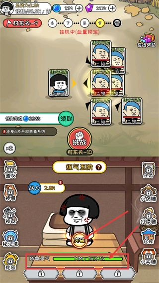 1、在【村东兴-9】界面,待【所需灵气-1.1M/153.2k】满足后点击【突破】,同时可准备挑战【村东兴-10】推进关卡。