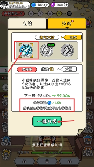 2、进入技能界面,针对【喵喵拳-10】消耗【1.5k-灵气】点击【一键升级】,提升其伤害倍率至99.40%。