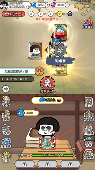 3、在【村东兴-9】的挂机状态下,点击【渡劫】按钮,同步留意【通关村东兴-9/10】进度以推进后续内容。
