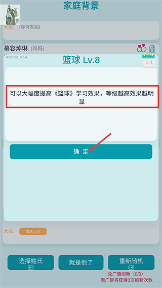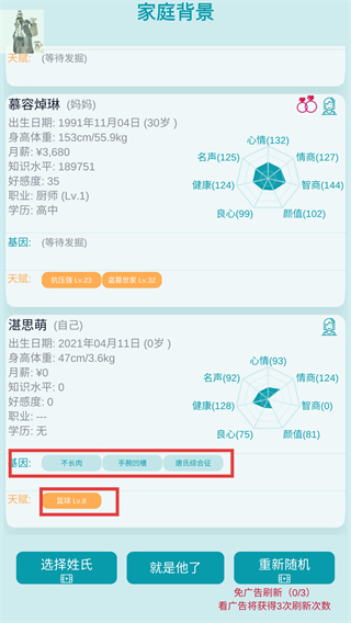 2、进入家庭背景界面后,核实角色【湛思萌】的基因信息及天赋【篮球-Lv.8】,确认无误后点击【就是他了】,即可正式开启游戏。