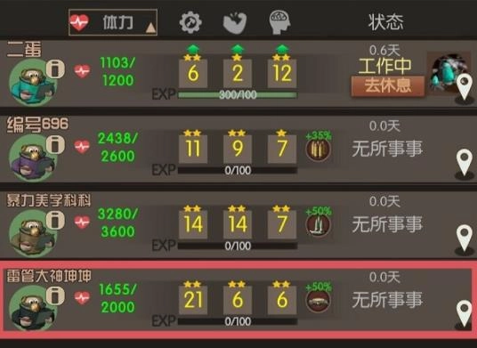 2.招募到二个合适的优秀小伙伴以后。记得留30的矿泉水,然后招募工程队。继续做新手引导。管理员可以升级属性的时候,需要去管理员休息室点击这个管理员,然后上面有界面升级属性。管理员必须在休息室闲着,并且在管理员休息室界面才可以解雇管理员,需要花费一定的解雇费用。