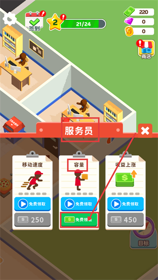 1、在【服务员】界面,选择【容量】对应的【免费领取】选项,提升服务员的承载能力,增强店铺的订单处理效率。