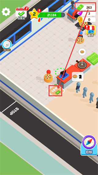 2、点击场景内的【100】标识,获取对应的金币资源,补充店铺运营所需的资金储备,保障后续操作开展。