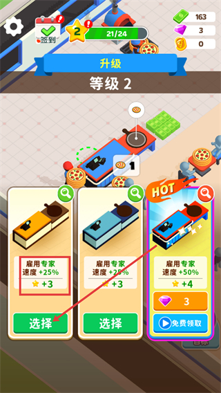 3、在【升级】-【等级2】界面,选择【雇用专家-速度+25%】的【选择】按钮,提升设备的运作速度。