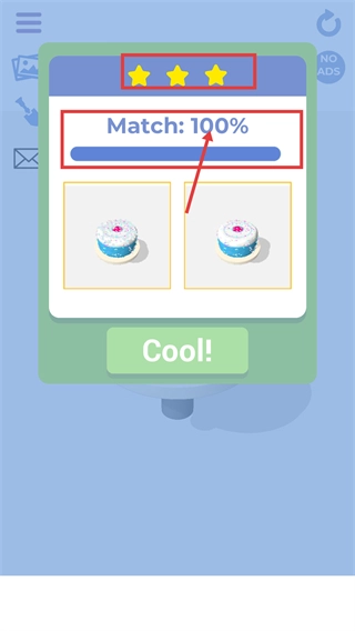 3、完成蛋糕装饰后达成【Match:-100%】的匹配度,获得三星评价,点击【Cool!】推进流程。