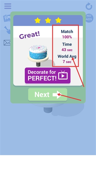 4、查看结算界面的【Match:-100%】-【Time:-43-sec】等数据后,点击【Next】进入下一个装饰关卡。