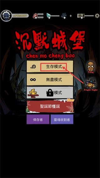 1、进入【沉默城堡】后,可选择【生存模式】-【无尽模式】等玩法,当前还有【圣诞节怪诞】活动,需选【幸存者】或【灵魂收割者】开局。