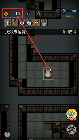 2、完成【找张床睡觉】任务,靠近床可获取【+2】金币,注意界面显示的【12】金币数值,同时留意【06:00】的计时。