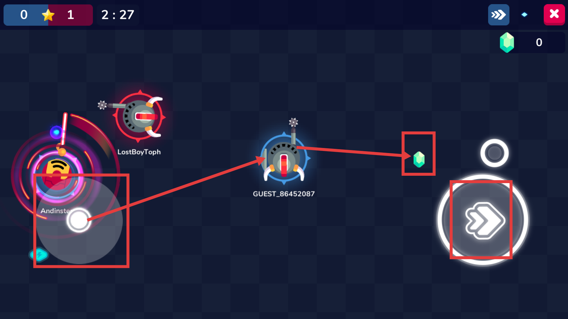 2、在游戏过程中,你可以通过左侧的控制区域来操控角色移动,借助右侧的按钮来发动攻击,建议优先去收集【宝石】以积累资源。