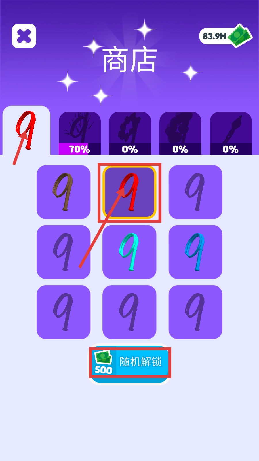 1、在【商店】界面中,你可以消耗资源点击【随机解锁】按钮,以此获取不同样式的鞭子道具,通过增加道具的多样性来更好地应对各类关卡场景。