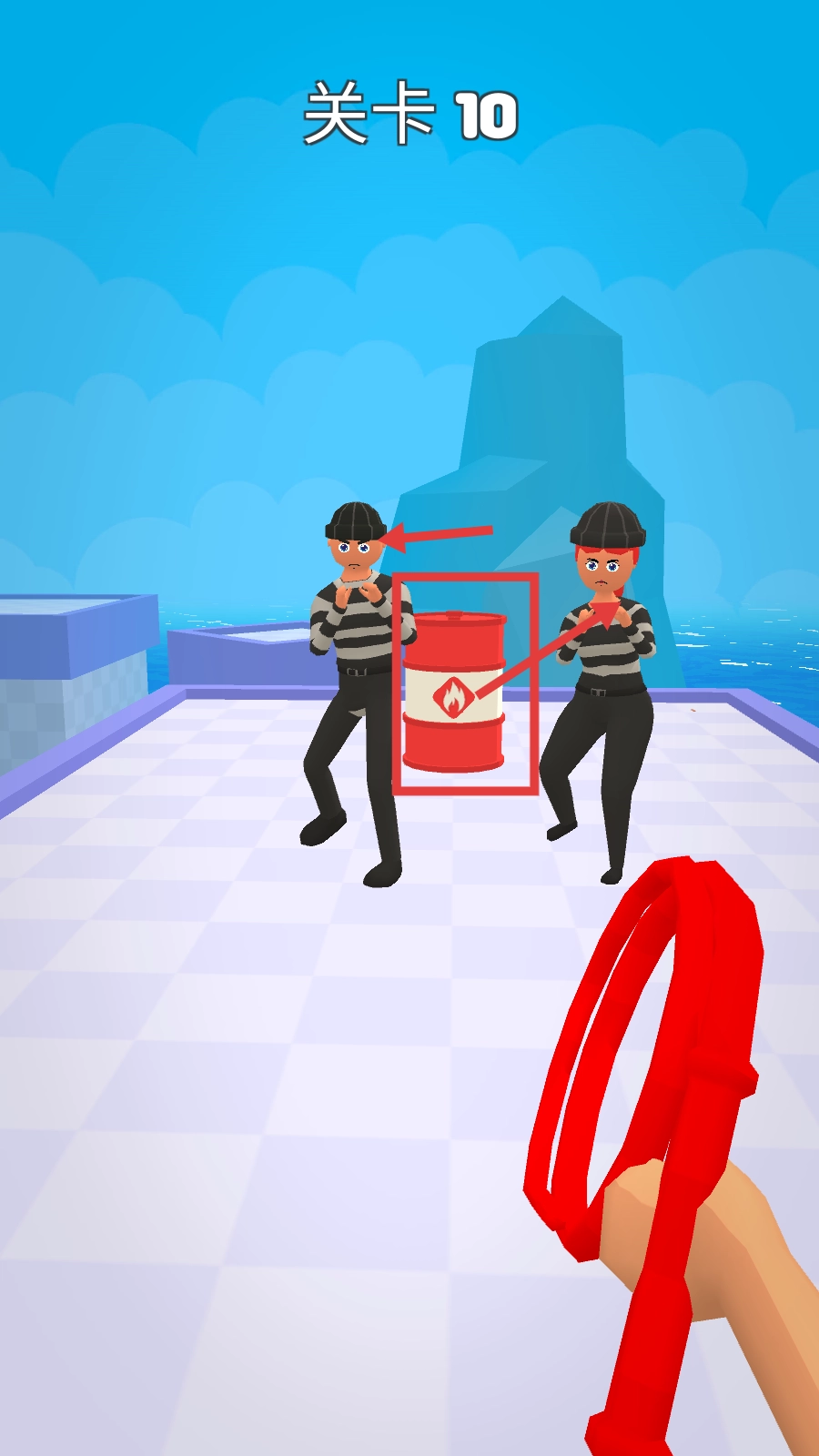 2、挑战【关卡10】时,优先留意场景里的【油桶-危险物品】,借助鞭子优先处理,防止被罪犯利用形成阻碍。