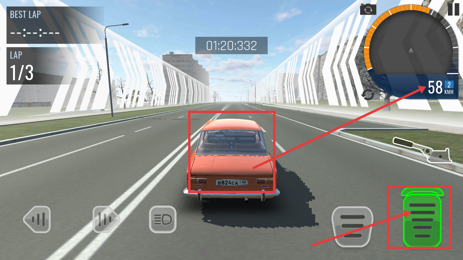 2、驾驶过程中,可通过右侧的油门键来控制车辆速度,比如要保持【58-KMH】的稳定行驶状态;左侧的方向键用于调整行驶方向,同时需留意【1/3】的圈数进度。