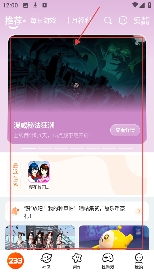1、在软件推荐页面,我们能看到【漫威秘法狂潮】的相关展示内容,点击该展示区域即可进入游戏详情页面。
