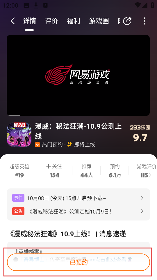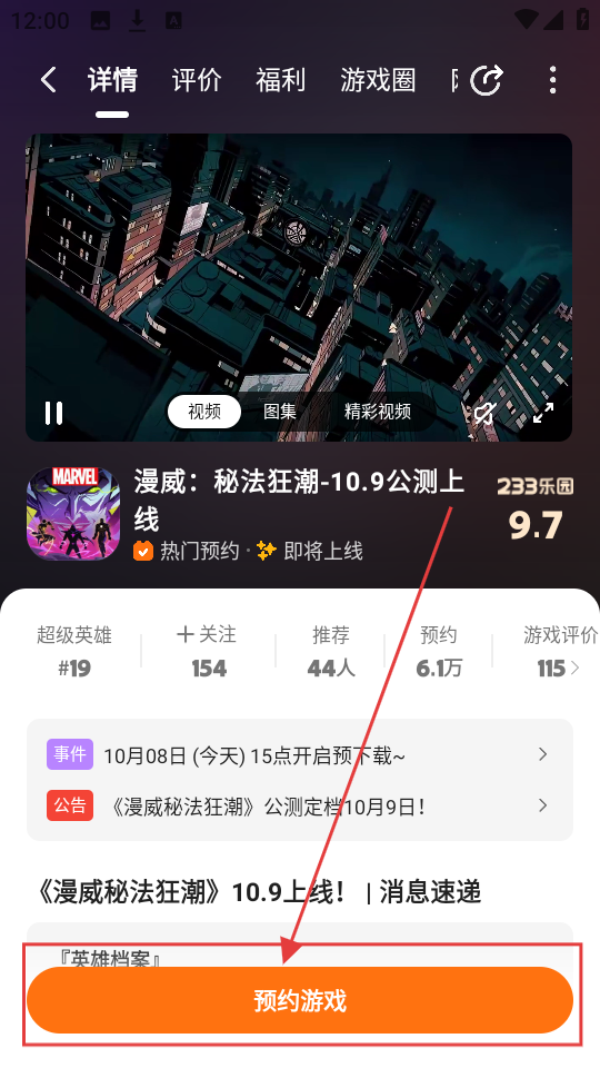 2、进入《漫威秘法狂潮》游戏详情页后,点击【预约游戏】按钮,即可完成该游戏的预约。
