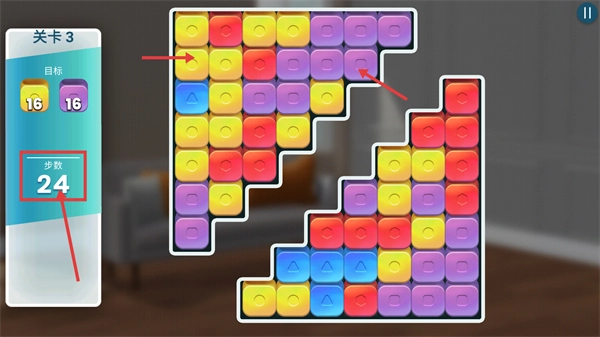 2、在消除界面,留意【步数-24】的提示,优先消除大量【黄色】与【紫色】方块,以此推动关卡进度。