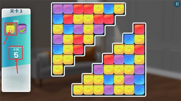 3、留意左侧的目标提示,当出现【黄色-7】的提示时,借助剩下的【步数-5】,以高效的方式消除剩余方块,从而达成收集目标。