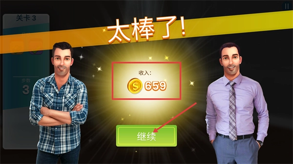 4、通关后会得到【收入-659】金币,点击【继续】按钮,就能开启下一关的消除挑战,以此积累更多金币。
