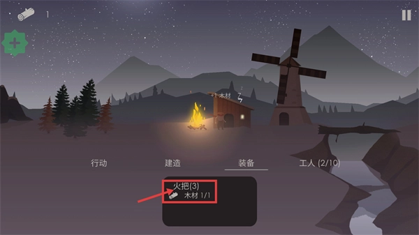 1、在装备界面注意查看【火把(2)-木材0/1】的资源需求,通过实际行动去收集木材,保证工人能在农场实现自给自足,以此维持生存所需。