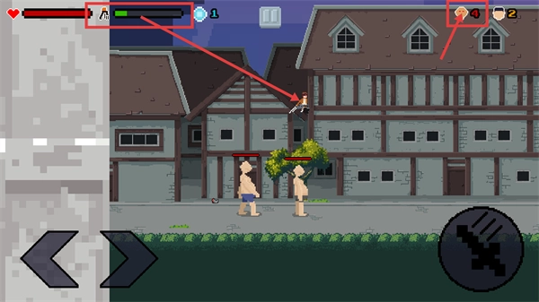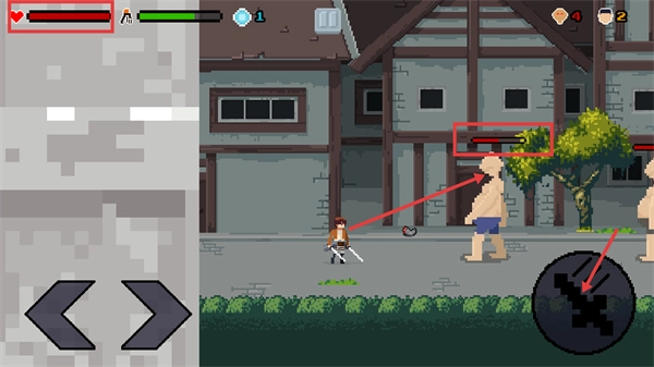 2、战斗时关注左上角血量和攻击条、右上角巨人计数,利用左右移动按钮走位,右侧攻击按钮攻击巨人,留意巨人的血量条。