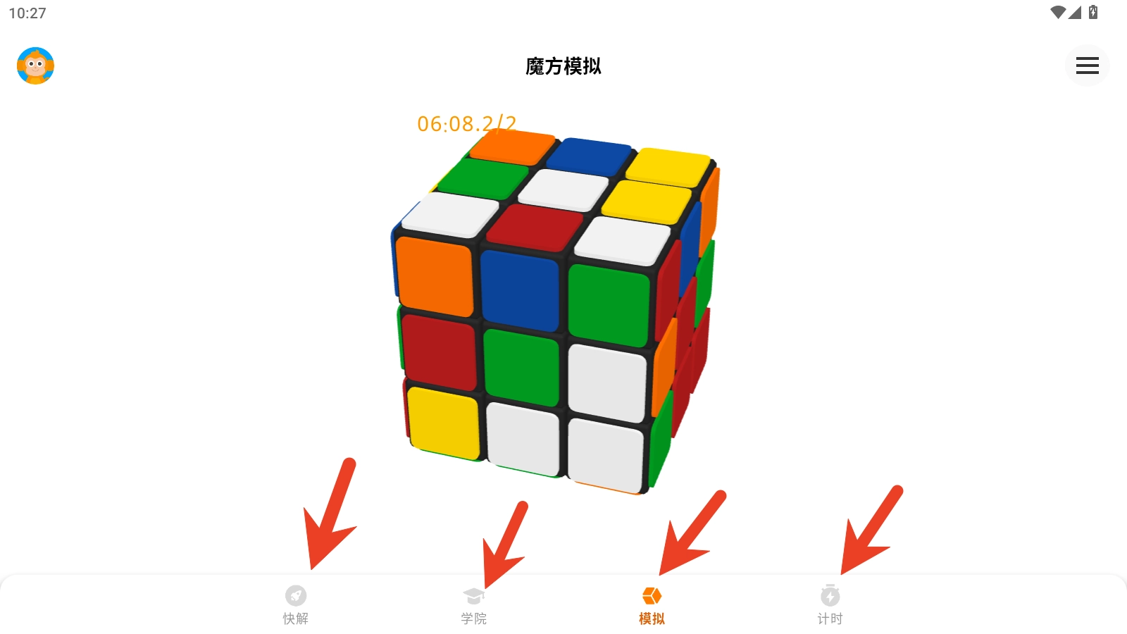 4、模拟与计时功能都属于魔方的实际操作环节,二者的差异在于:模拟功能不计算时间,更适合刚接触魔方的新手玩家;而计时模式则面向专业选手,用于测试其还原魔方的手速。需要注意的是,开启计时功能后,要先将魔方打乱,再进行后续的还原操作。