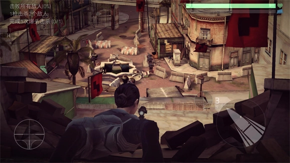 3、进入关卡后,左侧为视角移动区域,右侧设有射击按钮,关卡目标会在左上角呈现。