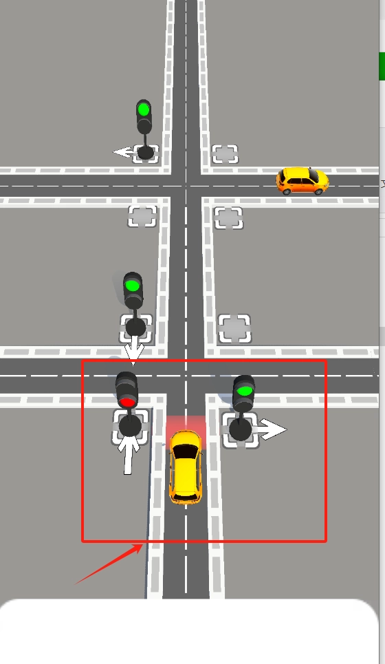 1、点击绿色直行箭头,控制车辆在绿灯时直行通过十字路口,避开其他车辆。