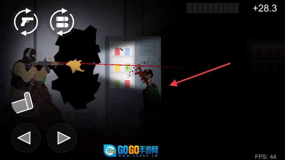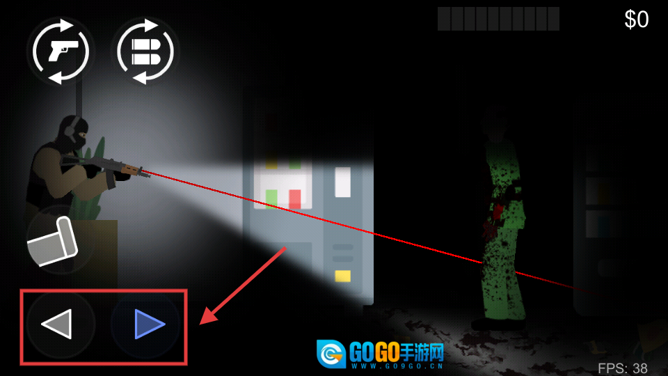 3、利用左下角的左右移动按钮来调整站位,以此躲避僵尸或者优化射击角度。