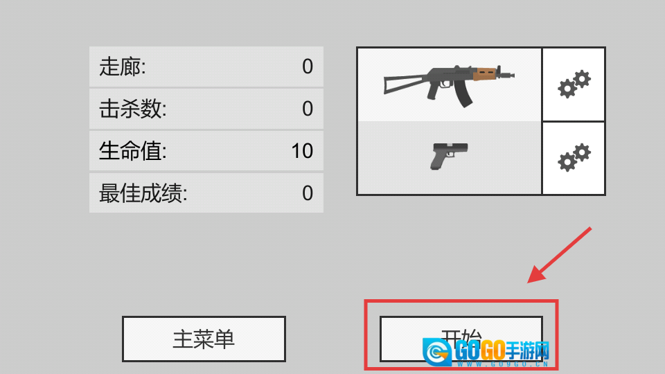 1、点击“开始游戏”按钮进入游戏准备界面,在该界面可查看武器和相关数据,随后即可开启僵尸防御挑战。