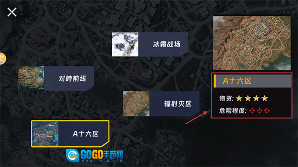 2、选择【A十六区】时要留意其高危险度,该区域物资充裕,适合积累资源,但务必做好战斗准备。