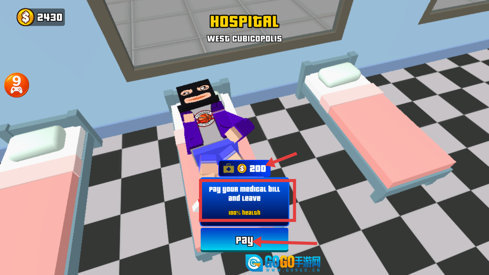 4、要是血量不够了,就去【HOSPITAL-WestCubicopolis】这个地方,交200美元的医疗费,点一下【Pay】按钮就能把健康值恢复到满格,然后接着玩游戏。