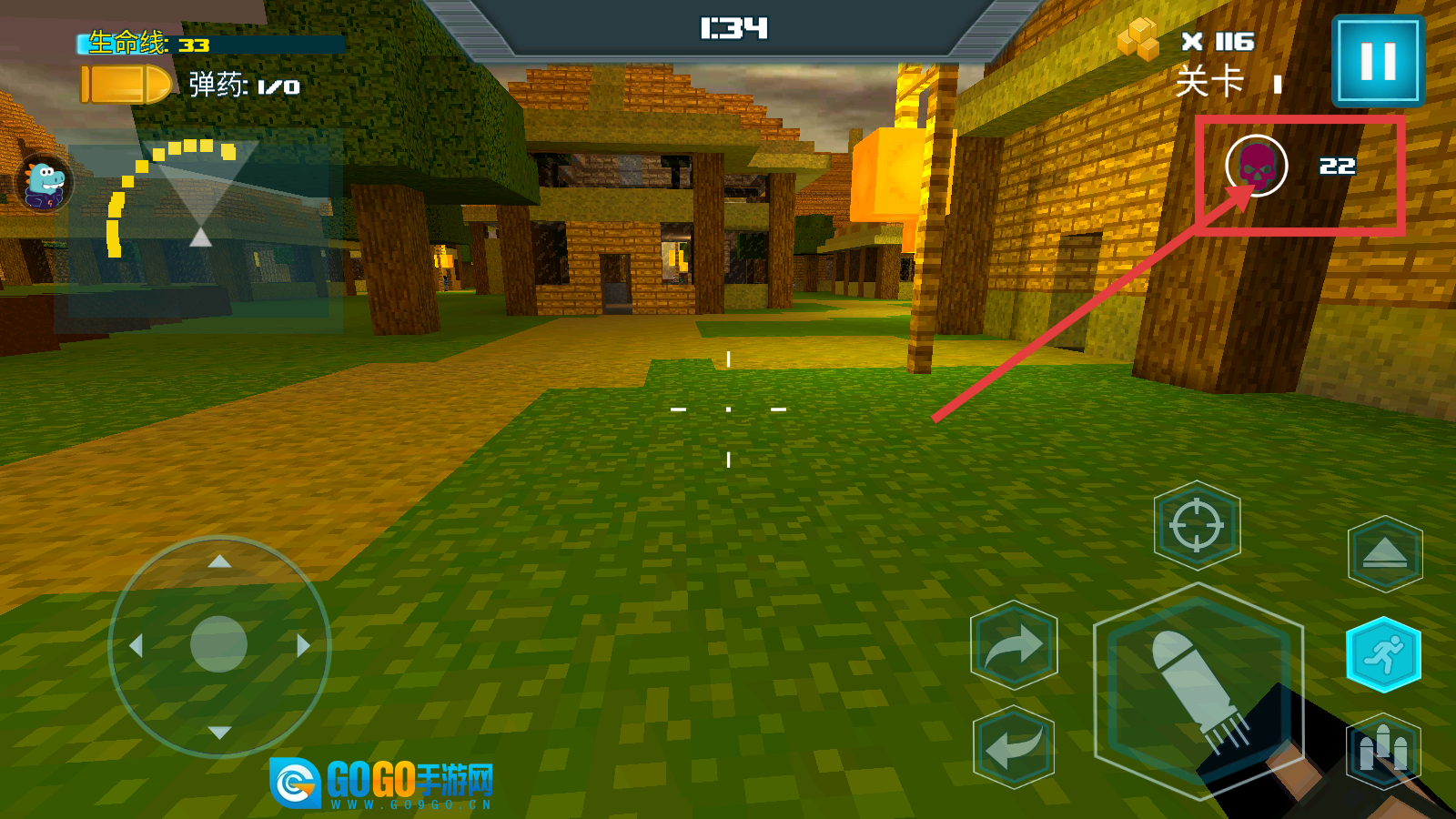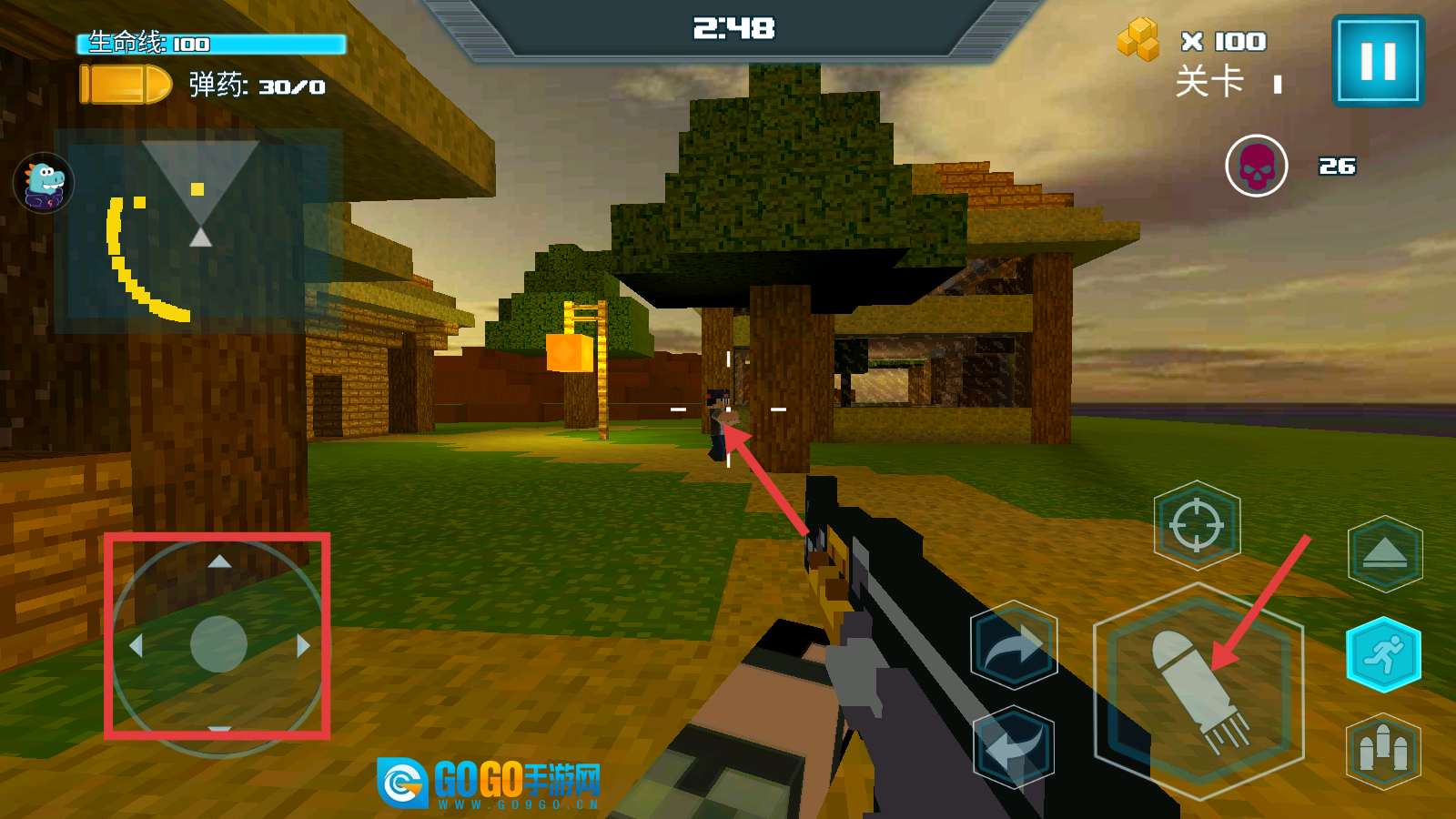 2、通过移动摇杆来控制角色行动,点击攻击按钮即可向敌人射击,同时留意界面上的【生命线-100】与【弹药-30/0】状态,保持稳健节奏逐步推进关卡。