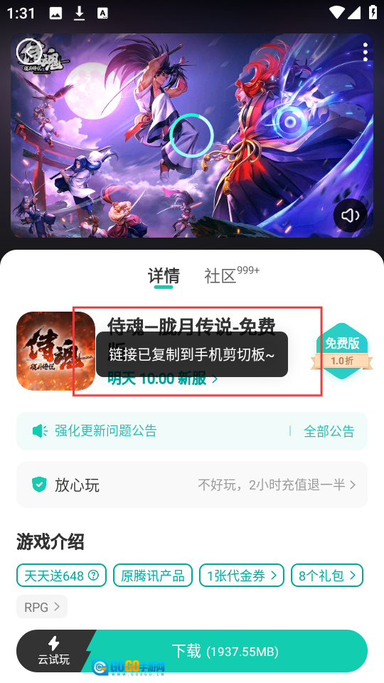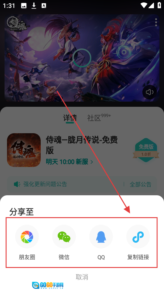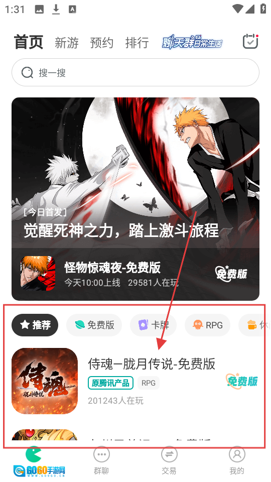1、在首页,点击【侍魂-胧月传说-免费版】,可进入游戏详情页,了解游戏信息啦。