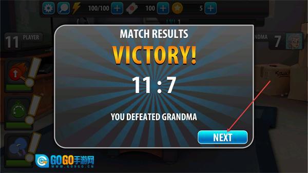 4、对战胜利后出现MATCHRESULTS界面,显示以11:7击败GRANDMA,点击NEXT按钮,即可进入下一场赛事挑战。