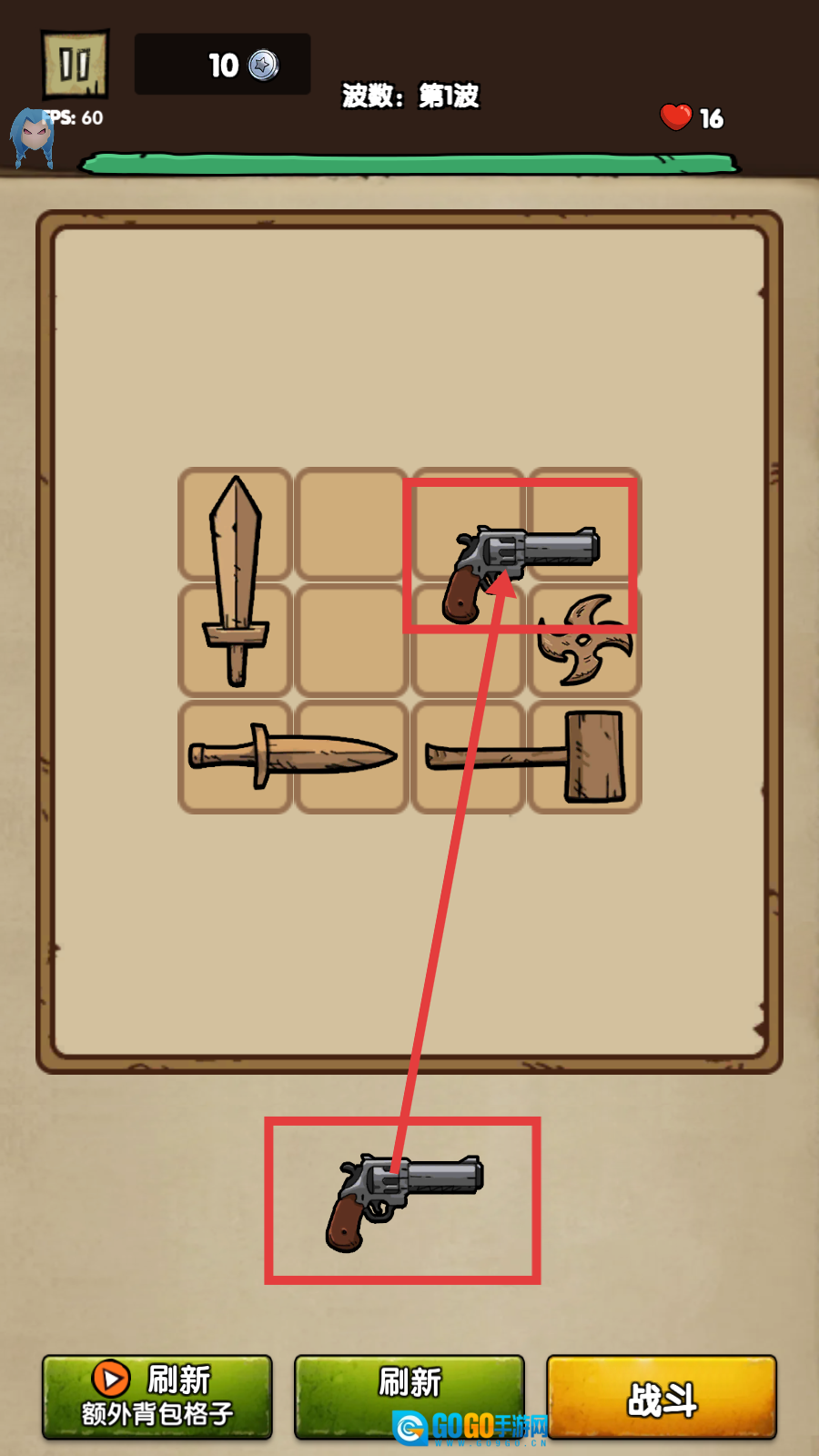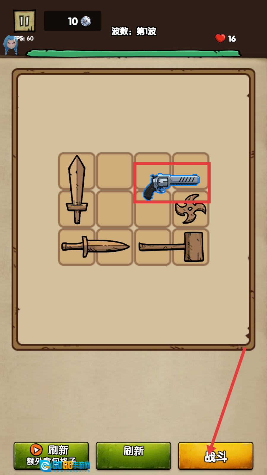 1、观察武器栏,将相同的【左轮手枪】合成升级,提升武器战力,为战斗打好基础。